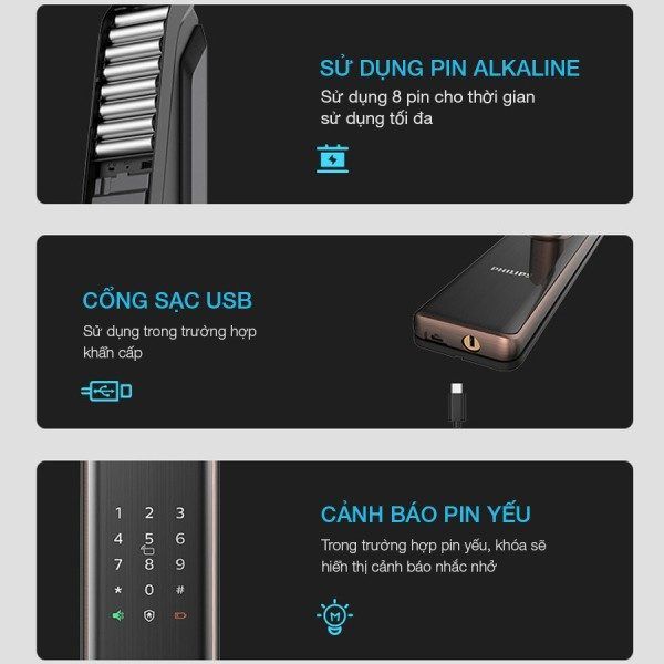 Bluetooth: Kết nối với ứng dụng Philips trên điện thoại, cho phép mở khóa từ xa trong khoảng cách 15–20m, cài đặt vân tay, thẻ từ, mã số và kiểm tra lịch sử ra vào.